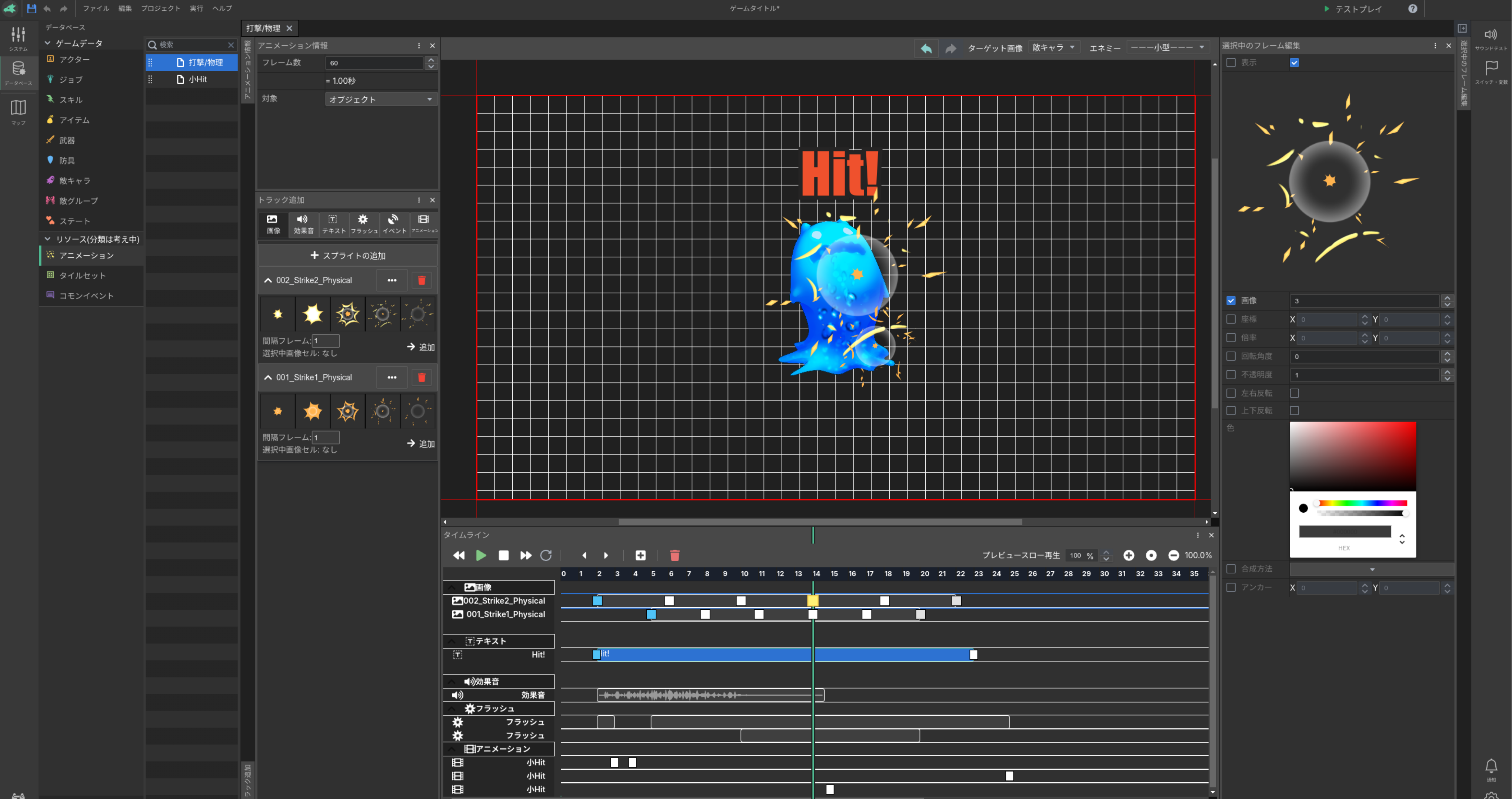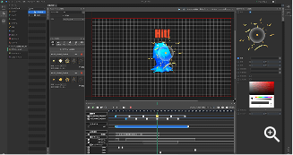 画像や音などの素材や、イベントをプレビュー・タイムラインに配置してアニメーションを組み立てます。アニメーションを入れ子にして再利用性を高めることもでき、2Dアニメーションを効率よく作成できます。